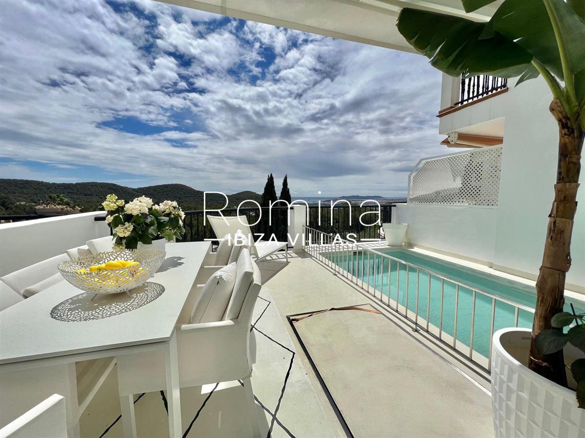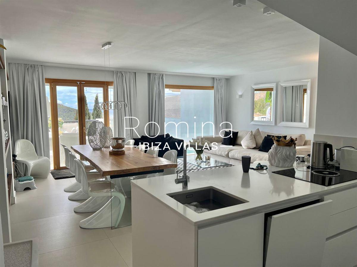 La cuisine ouverte s’ouvre sur une terrasse magnifique avec vue sur la piscine, la vieille ville d’Ibiza et Formentera.
