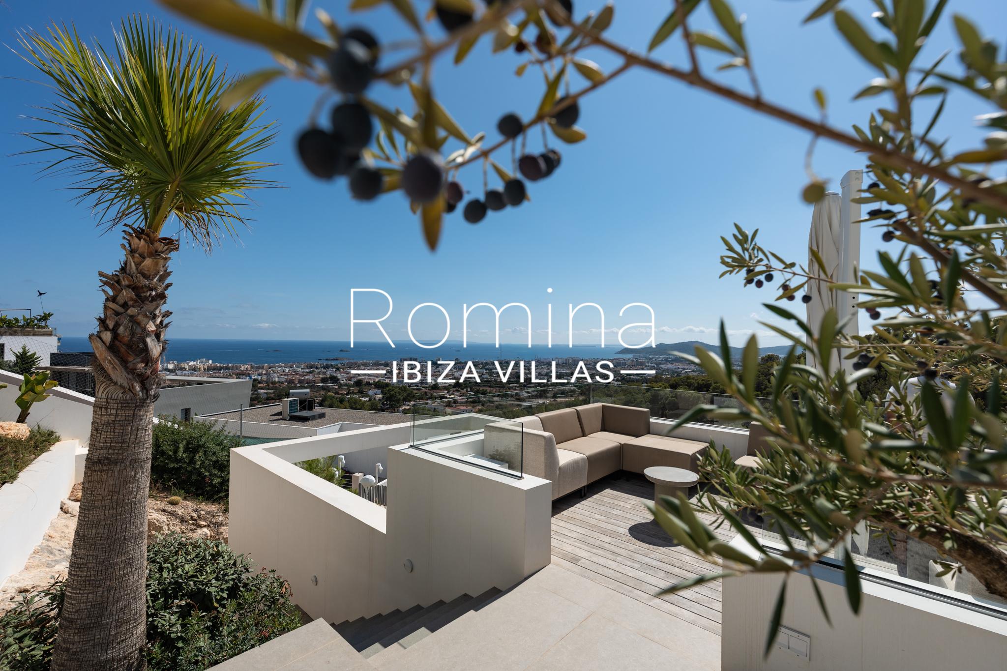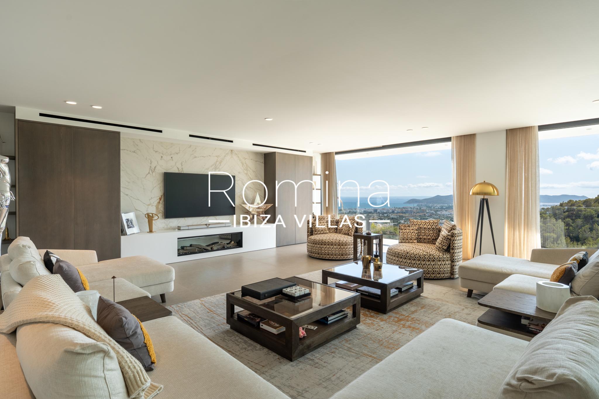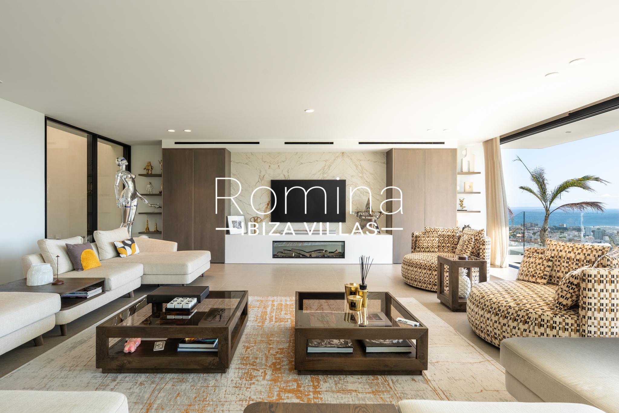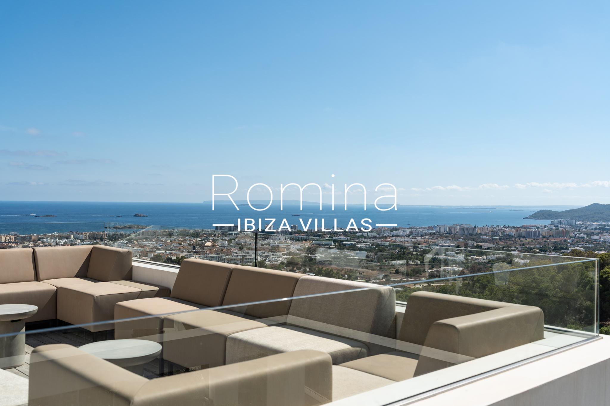 Implantée sur un terrain de 2 500 m², la villa développe environ 550 m² habitables et bénéficie de vues panoramiques exceptionnelles sur la mer Méditerranée, Formentera et la ville d’Ibiza. Son orientation assure une luminosité naturelle constante ainsi que de superbes couchers de soleil.