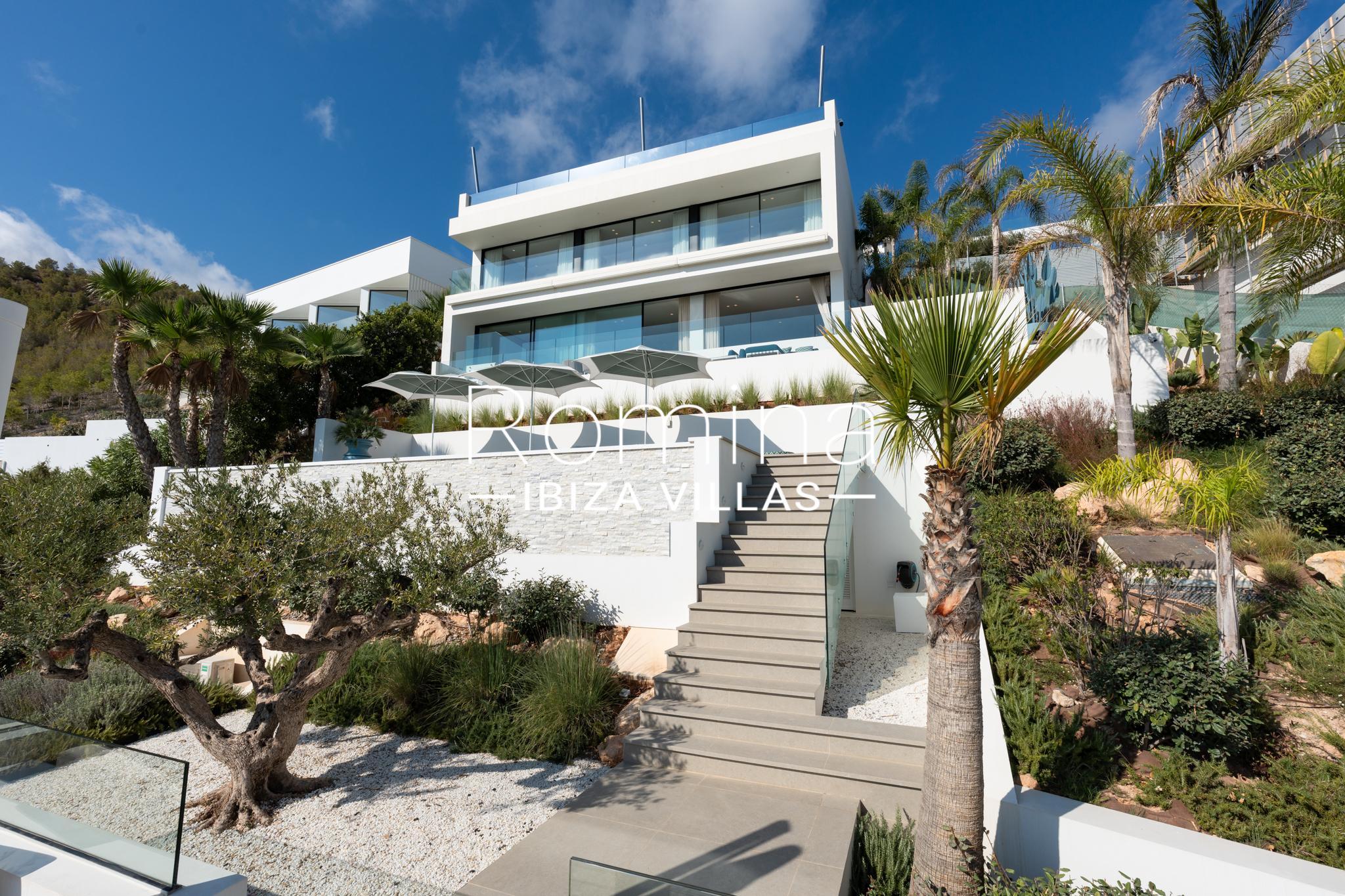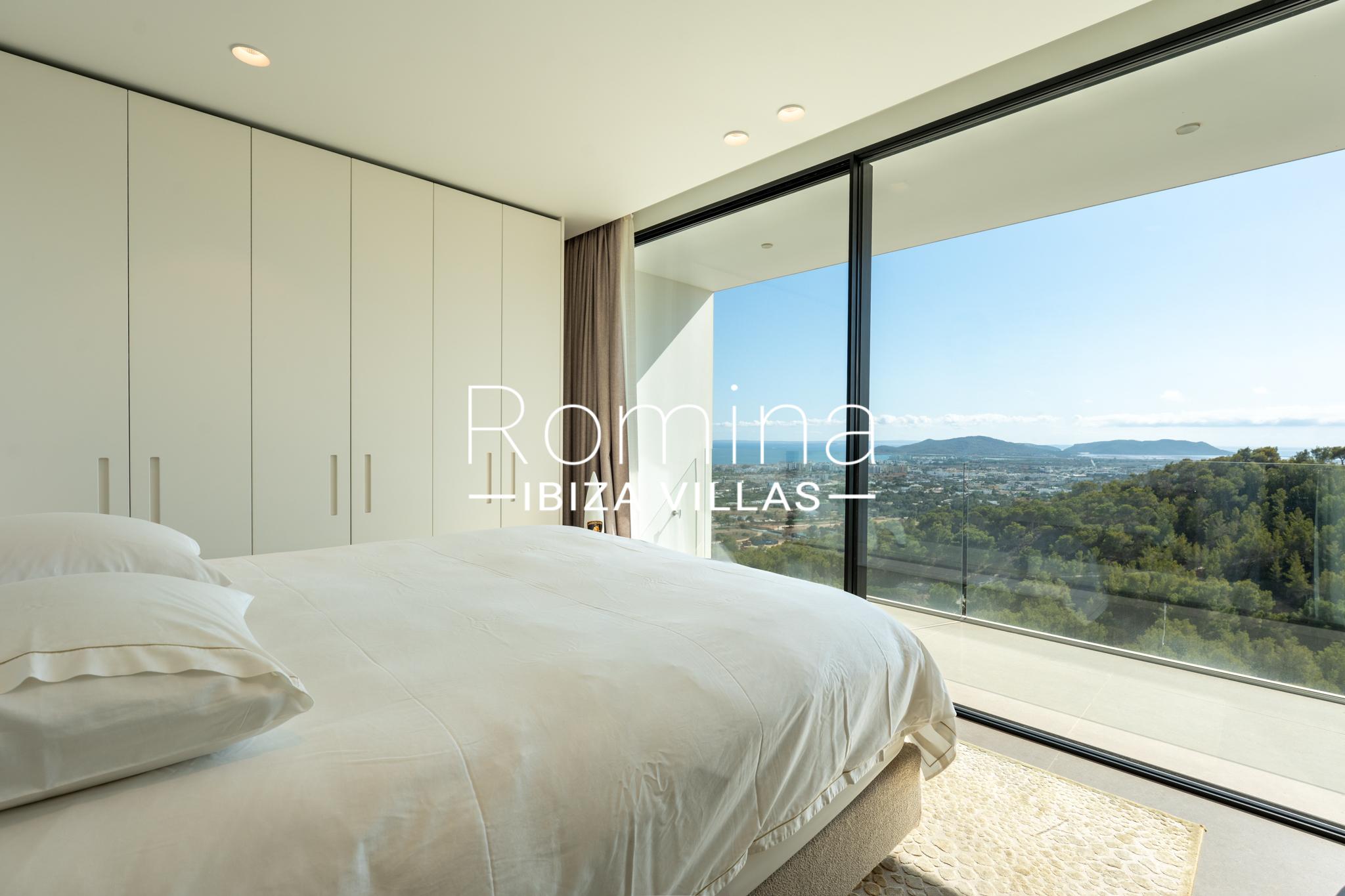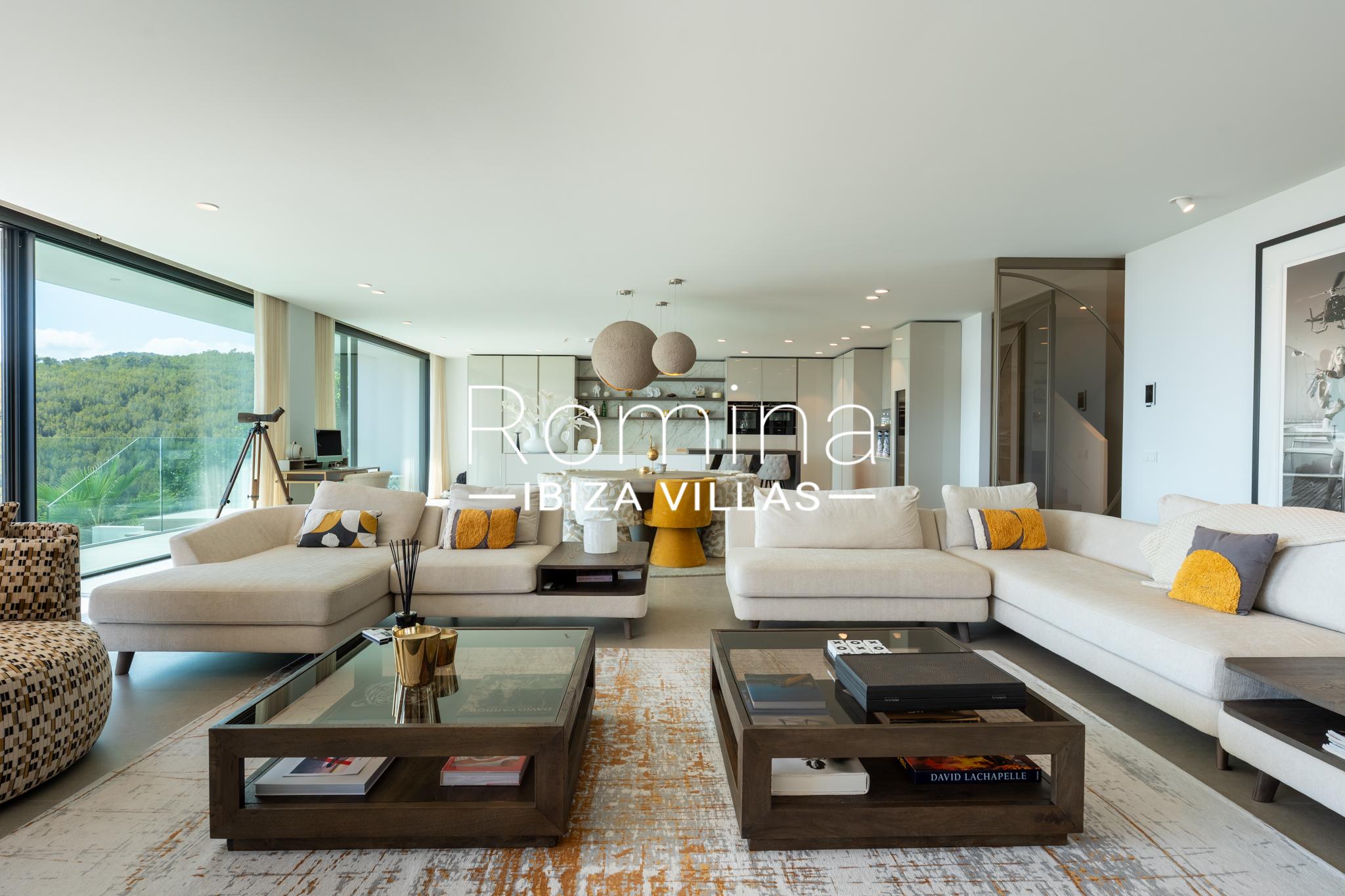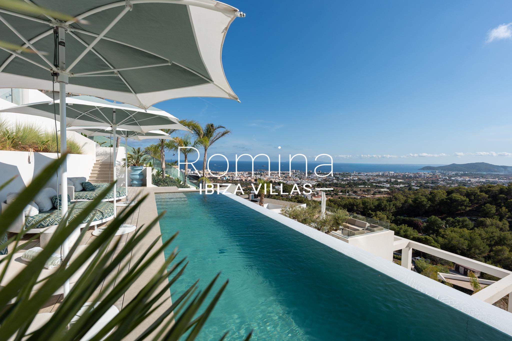 Implantée sur un terrain de 2 500 m², la villa développe environ 550 m² habitables et bénéficie de vues panoramiques exceptionnelles sur la mer Méditerranée, Formentera et la ville d’Ibiza. Son orientation assure une luminosité naturelle constante ainsi que de superbes couchers de soleil.