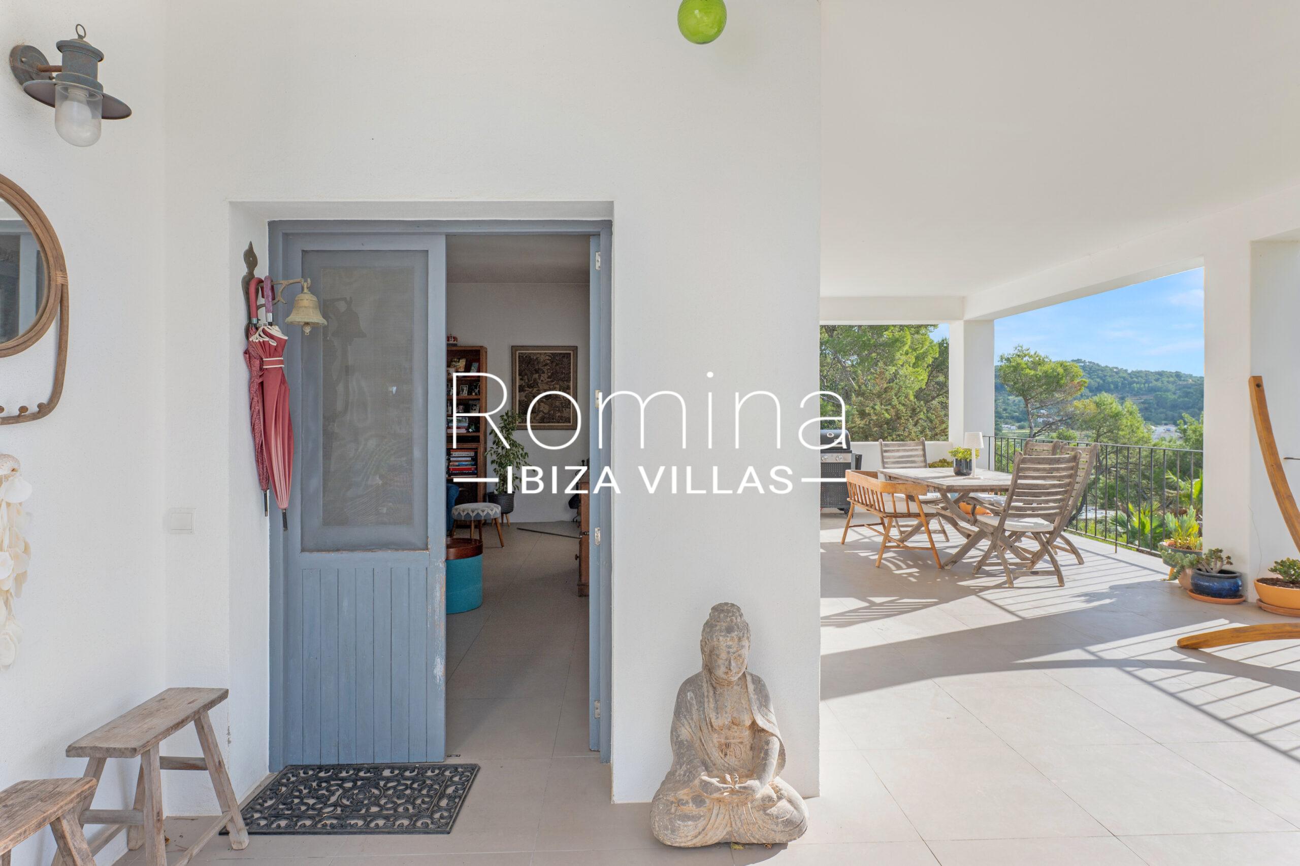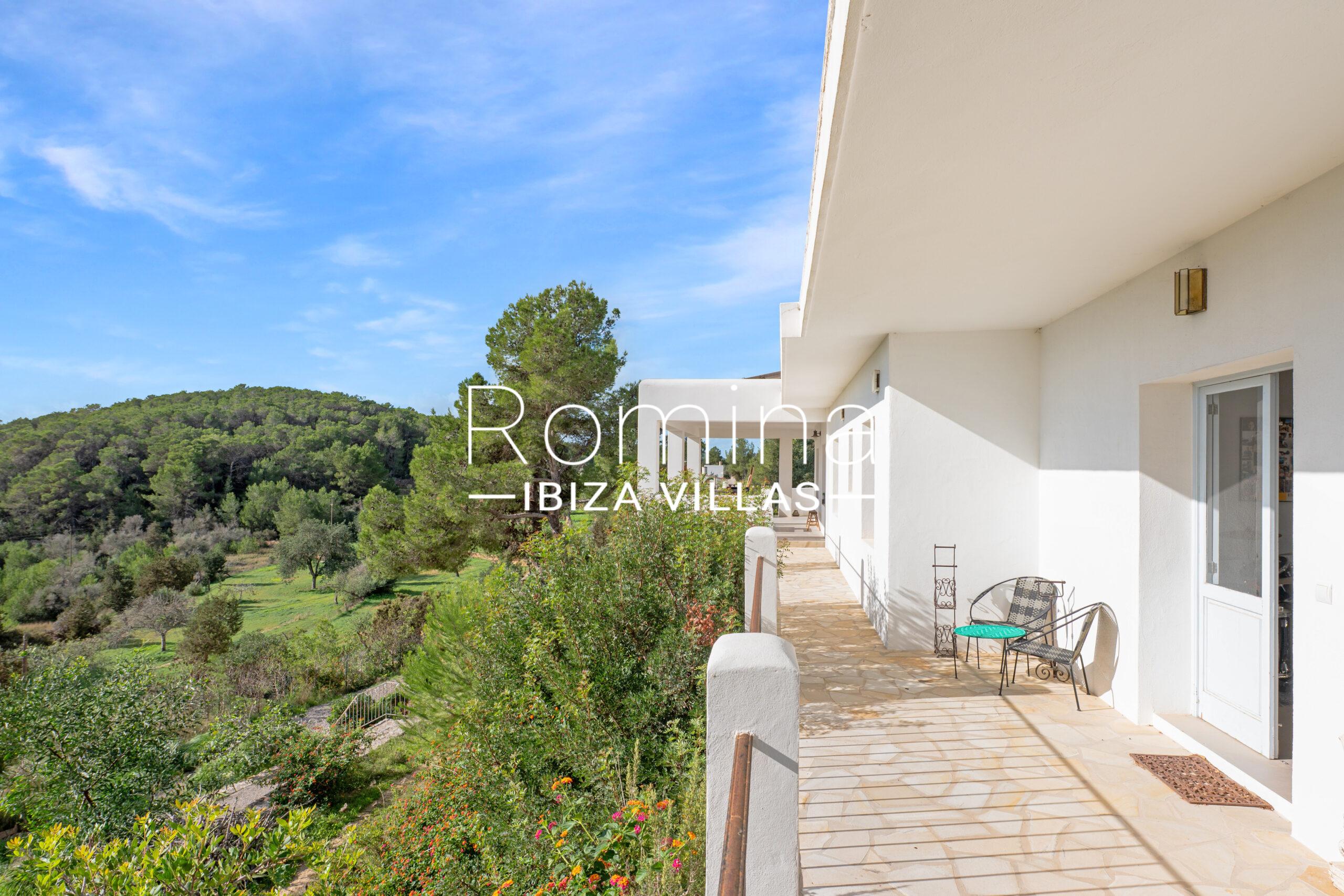 La maison principale comprend cinq chambres bien proportionnées et trois salles de bain, ainsi qu’une cuisine lumineuse ouverte sur un vaste salon. De grandes baies vitrées encadrent le paysage, tandis qu’un poêle à bois, la climatisation et le chauffage central garantissent un confort tout au long de l’année. L’intérieur s’ouvre directement sur un large porche couvert, idéal pour les repas extérieurs et la détente. Les terrasses attenantes prolongent l’espace de vie, offrant des vues panoramiques jusqu’à la mer.