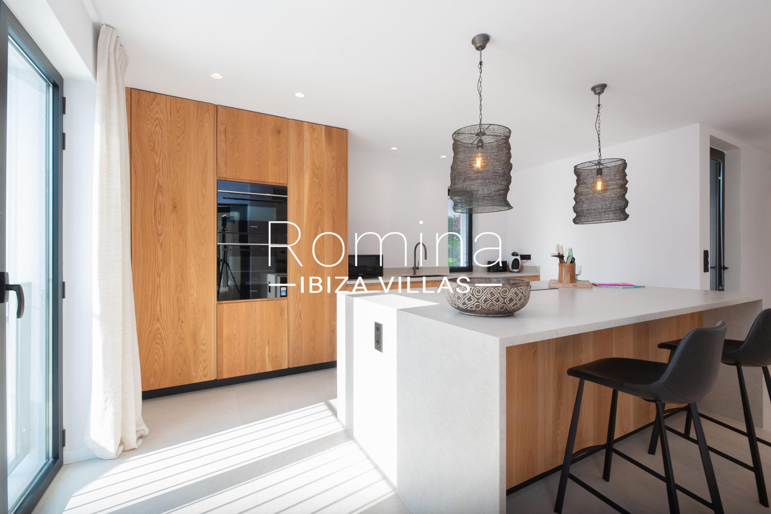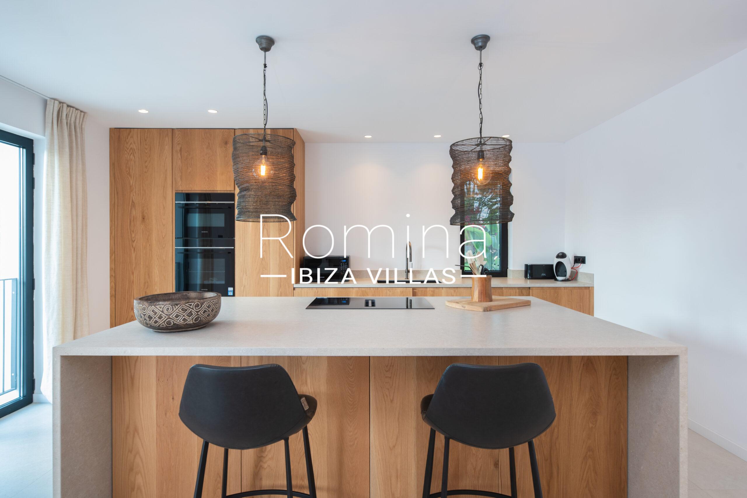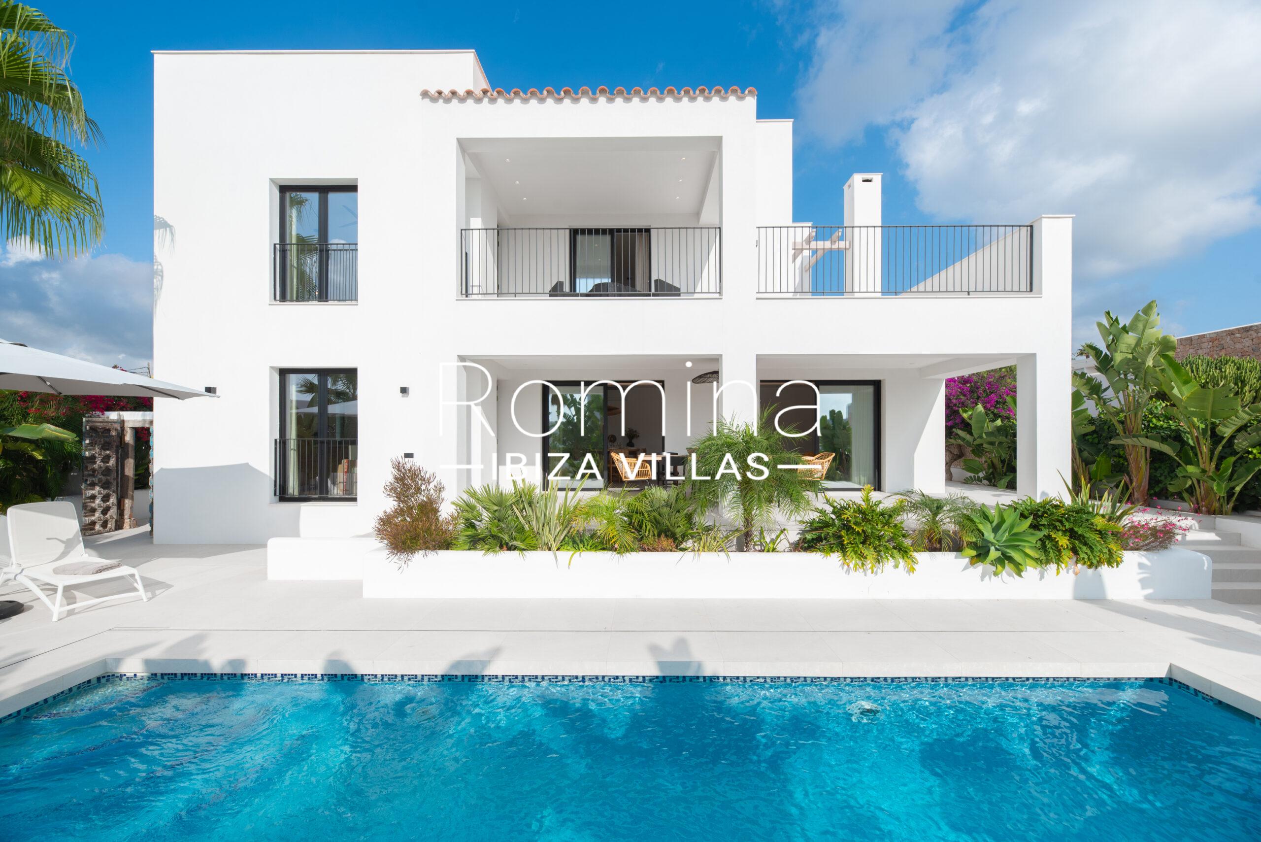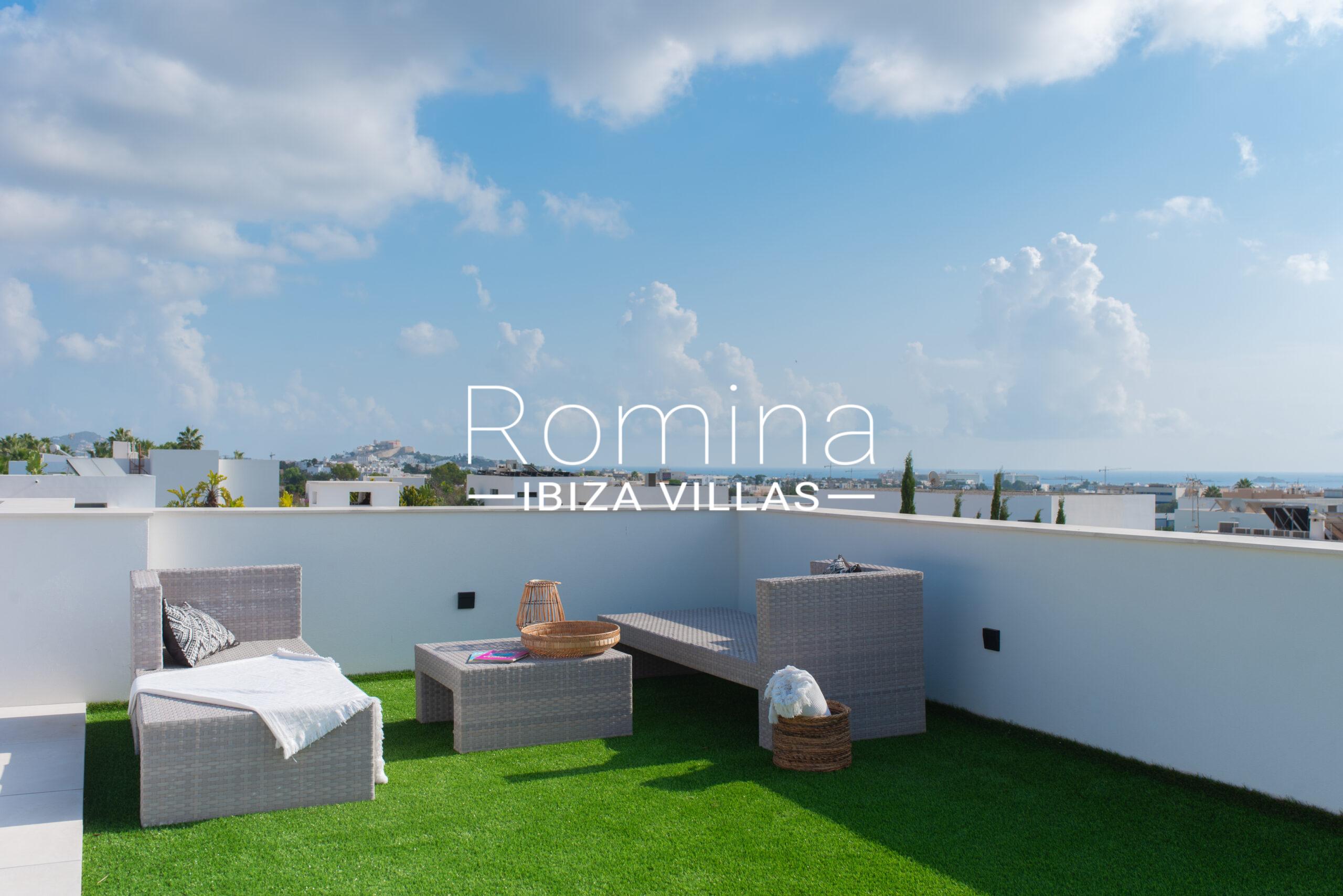 Diseño moderno con grandes ventanales y cocina abierta con isla central. En el exterior, una terraza privada con zonas de descanso y comedor, jardín y piscina. La azotea ofrece vistas panorámicas a Dalt Vila.