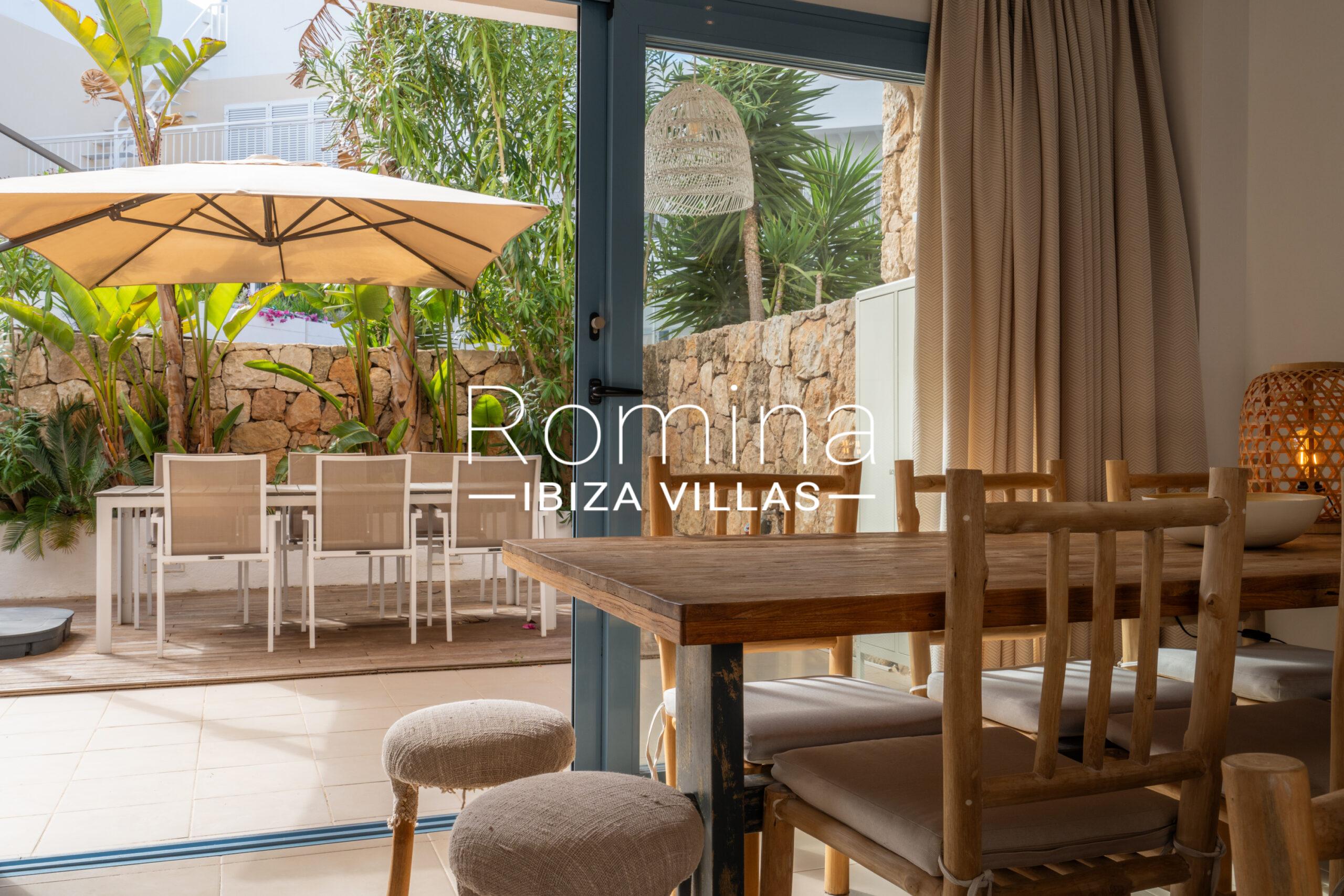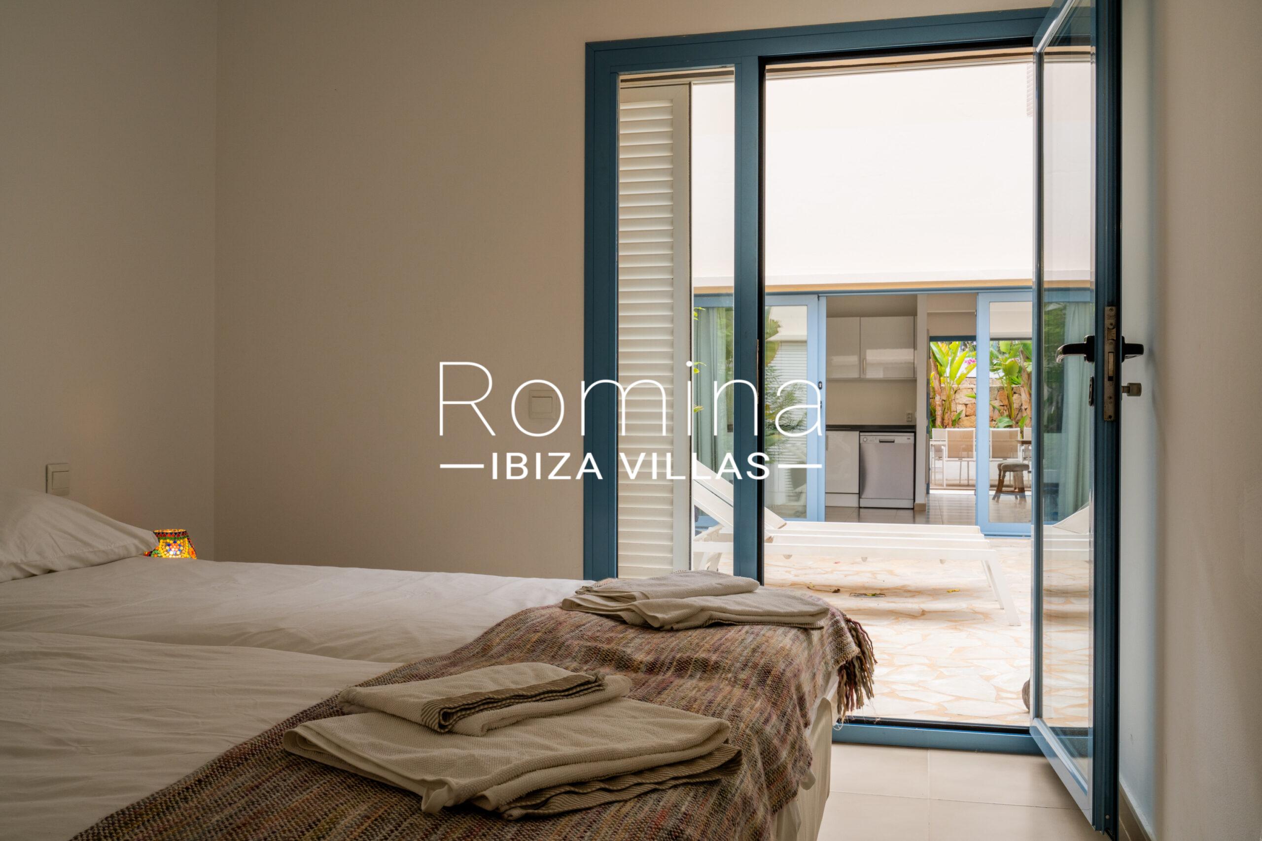 Si accede alla proprietà attraverso il giardino anteriore e la prima terrazza, bagnata dal sole. Grandi porte scorrevoli conducono al soggiorno-pranzo e alla cucina a vista, completamente attrezzata con tutti gli utensili necessari. Da qui si accede alla terrazza del patio con la piscina. Nella parte posteriore del patio ci sono due camere da letto indipendenti, ognuna con il proprio bagno.