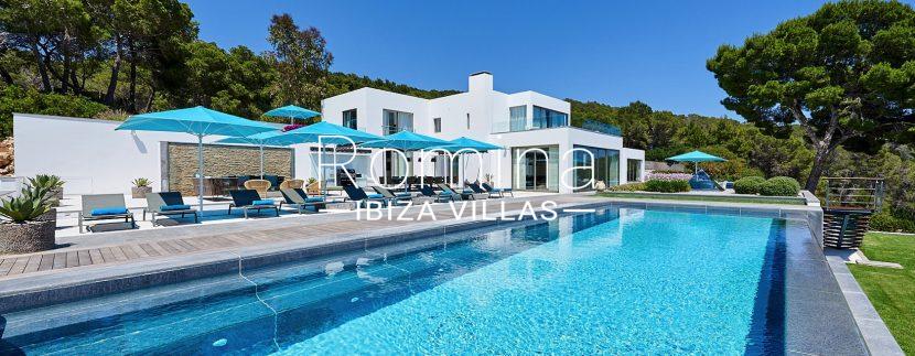 Preciosa villa de diseño contemporáneo ubicada cerca del pueblo de Santa Gertrudis. Bonitas vistas sobre Ibiza, el mar y Formentera. Salón luminoso, comedor, cocina equipada, 6 dormitorios, 6 baños. 2 piscinas, terrazas, chill out, pérgola. Aire acondicionado centralizado – Calefacción de suelo radiante.